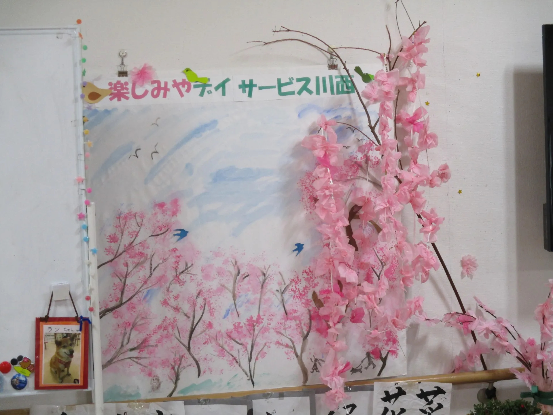今月の壁画はお花紙を桜の花に見立てました