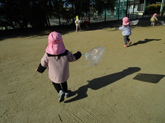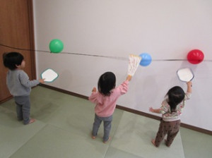 手作りの羽子板を使って風船を“えいっ” 「たのしいね」と笑顔の子どもたちです☆